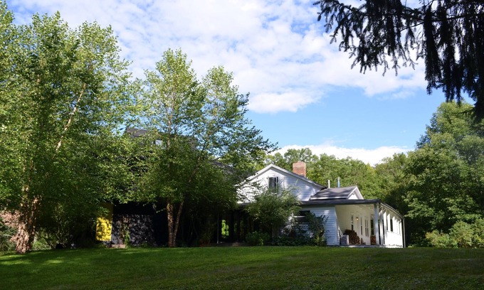 Welcome to our home. The original farmhouse was built in 1790, as you can see, the old fireplace dates that far back. In 2006 we added 3,000 square feet. We opened up the first floor into one large loft-like space that overlooks the forest, the streams, and has a wrap around porch, as well as a deck. The open kitchen has a large farm table for casual meals, and the dining room has a long hand hewn table that seats ten. There are two living rooms, one with a TV screen, and the old fireplace, the other has two large linen sofas and a wood burning stove. All spaces are open and connected with easy access to the outside spaces. Upstairs are three large bedrooms for your use, with three bathrooms. The house is light, open, and airy, but also very cozy. Because of the open staircase it is not suitable for children and elderly people who need two handrails. We are in architecture and interior design and the house has been published is several books. But don't let that put you off. It's very cozy and livable. The sound of the stream below the house (it's built on a hillside) is my favorite feature of our home. We sit on ten acres of mostly woods, but around the house there is a large lawn, a long driveway, and bamboo trees shield us from the quiet dead-end road. I grow a vegetable garden, there's a garage for gardening stuff, a rock garden in the hillside, and as I mentioned, several streams run behind the house. There is plenty of wildlife, like deer, wild turkeys, chipmunks and squirrels. and loads of birds, including a heron who has visited our stream for years.