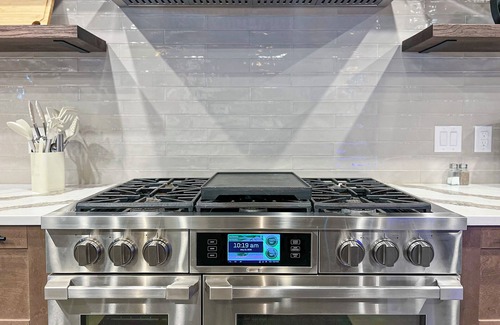 Chef-Style Kitchen: 48” gas stove, double-wide fridge/freezer, ice maker, updated cabinetry & appliances, island seating for 6,fully stocked cookware