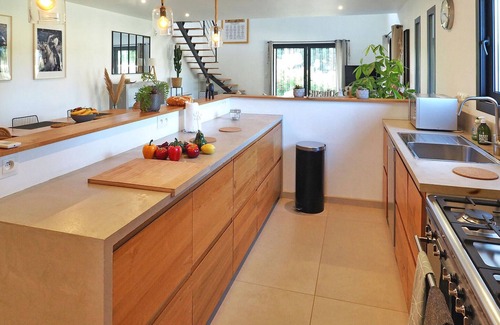 Situated on a horse farm just 10 minutes from Saint Rémy de Provence, this modern cottage offers an idyllic retreat. Immerse yourself in the elegant decor, complemented by a private garden, swimming pool, children's games and a charming oleander garden surrounded by horses. On the first floor is a spacious, air-conditioned open-plan living room. A modern open staircase leads to a mezzanine reading area with air conditioning, the perfect place to sit and escape the warm summer sun. Outside there is a private swimming pool (9 x 4.5 m) with pool house, surrounded by a terrace with a table and 6 chairs and garden furniture for 4 people. Children will love the wooden hut on the terrace and the garden swing. Experience peace and luxury in the heart of Provence. Important notes: The living room and upstairs landing have air conditioning. Although there are horses nearby, they are not allowed in the garden. The cottage adjoins at the rear and has an agricultural shed not connected to the riding school. The owners live on the same property and ensure an attentive service without disturbance.