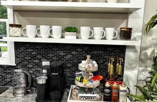 A fully-stocked custom coffee and tea bar greets you in the morning, inviting you to start the day with your choice of beverage. The bar is stocked with a Keurig coffee maker, electric tea kettle, coffee pods and tea bags, flavored syrups, sweeteners, bottled water, and and hot chocolate with marshmallows. You’ll feel like you just stepped into your favorite gourmet coffee shop!