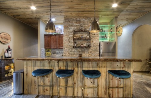 This property is equipped with fantastic amenities that cater to every aspect of your wedding celebration. The expansive indoor living area features an open-concept kitchen, dining, and living spaces adorned with vaulted ceilings, providing an inviting ambiance for hosting guests. Outside, enjoy the stunning covered patio with BBQ grills, outdoor TVs, and a relaxing saltwater hot tub, ideal for post-celebration relaxation. You have ample accommodations with five beautifully appointed bedrooms, including a lavish master suite, while additional recreational spaces, like the Buffalo Lounge and sauna, ensure everyone feels right at home during their stay.