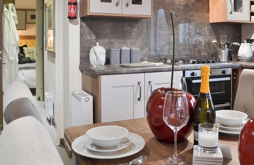 Shower Room: Cubicle Shower, Heated Towel Rail, Toilet. LPG central heating, gas, electricity, bed linen, towels and Wi-Fi included. Welcome pack.. Decking with garden furniture and gas BBQ. Hot tub for 4 (private). Gym (shared with other properties on-site, free to access). 1 small dog welcome. Private parking for 2 cars. No smoking. Please note: Couples and family bookings only, sorry, no hen, stag or single parties please.. This boutique style lodge is stunning and situated in the heart of tranquil Bridlington Links Golf & Leisure Estate, right on the East Yorkshire coastline and within a few minutes walk of the beach. This beautifully presented lodge is ideal for adults wishing to enjoy a relaxing break away. Step inside and the property boasts an interior designed open-plan living space, with a large sofa (doubles as a sofa bed for two) and two fabulous armchairs placed around a cosy fire; this is the ideal place to relax and unwind whilst watching your favourite show after a long day sightseeing. The dining area sits close to the kitchen and offers seating for six. It makes for a wonderful social space to gather and enjoy a meal and a glass of something chilled. The kitchen is beautifully designed and incorporates a large larder with oodles of space; ideal for storing all your holiday essentials. The kitchen comes complete with a gas cooker and hob, and a range of high end appliances including a coffee machine and dishwasher, perfect for cooking delicious evening meals or a hearty breakfast before heading out for the day.