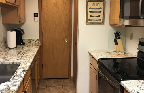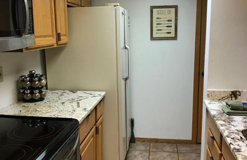 Our kitchen has granite counter-tops and stainless steel appliances. It is completely stocked with plates, utensils, cookware, and bakeware, including a spice rack and a Crock Pot. The condo also has a washer and dryer in the unit.