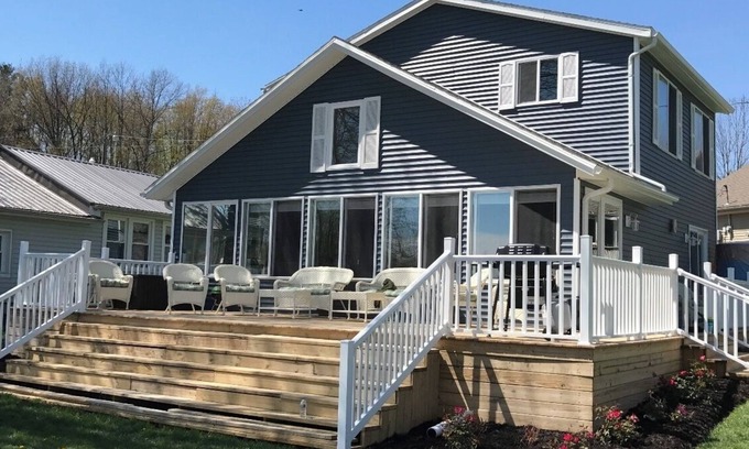 Absolutely stunning lakefront home right on Nettle Lake and EVERYTHING is new! 180 degree views of Nettle Lake from every room in the house! The entire home has been remodeled right down to the studs! First floor master bedroom with its own gorgeous master bathroom! Three good size bedrooms upstairs with full bathroom! Additional first floor half bathroom. Very open floor plan with a beautiful new kitchen with granite counters! The great room has vaulted ceilings with a wall of glass to enjoy the lake views! Grab a drink and a cigar and enjoy the 600 sq. ft. wrap around deck! We have our own private dock for your boat or toys as well as a public boat launch right down the street! Our home is perfect for ALL seasons as well as deer hunters during the seasons for Ohio, Michigan and Indiana! An assortment of water toys including, two kayaks, a HUGE 21'' raft that supports 14 adults, life jackets & floaties are provided to our guest! We are also only 4 minutes away from a day of hiking the beautiful Lake La Su An State Park! TRUE LAKEFRONT ENJOYMENT!**Beautiful pontoon available for rent**. **Please note that we want everyone to enjoy their stay at our home but if you are hoping to have a big party, please choose another home. We are meticulous about our properties and would like them to remain that way.**