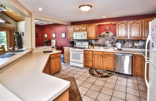 Your great room offers floor to ceiling windows looking directly into the water. 100 year old Red Pines grace the yard as part of the landscape. A big screen tv, 22' high cathedral ceiling, and stone fireplace warm the living area. The dining area and custom kitchen flow nicely from the great room into an open living concept.