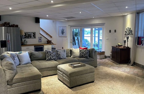The lower level has a great room with a 82 inch 4K big screen TV !!!, Disney, Netflix HBO and more Xbox and Wii games, wine cooler & ice-maker, 2 bedrooms and a bathroom. Walk out of the lower level to a large screened porch with a ping pong table and another covered patio with rocking chairs.