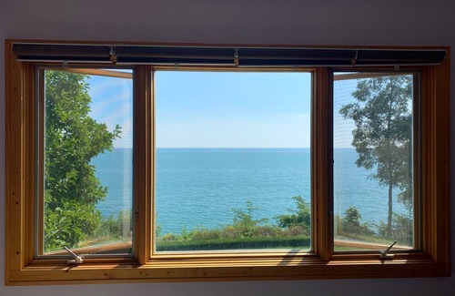 As you walk down the stone path and through the door, your cares will fade and your eyes will rise to the vast lake that is one of our continent's greatest. At sunrise the water shines like diamonds, calling you outside to walk past the boathouse, under tall trees and over an expanse of lawn into the old orchard, then wind through the garden and down the path to the lake. Have coffee at the shore, scanning the water where you'll swim and kayak. In the luminous sunset, prepare dinner facing the kitchen's wide bay window, then eat on the terrace in the golden hour. Laidback comfort and nature's peace and grandeur. A sanctuary to refresh and inspire with a feeling that life's horizons are endless. 6-8 guests will fit most comfortably, though there are beds to accommodate up to 10.