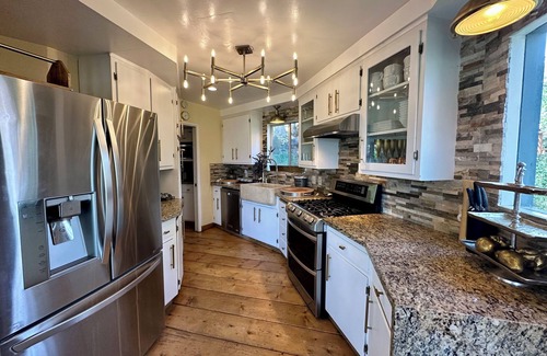 This exquisite accommodation features modern amenities blended with rustic charm, making it an ideal choice for your special day. The home comfortably hosts large groups, offering separate living spaces to accommodate families and friends. You can enjoy leisurely gatherings on the new decks while soaking in the amazing views. The property also welcomes pets (with a maximum of two), allowing your furry friends to join in the celebration. A small additional fee applies for pet stays, ensuring everyone feels at home during your wedding festivities.
