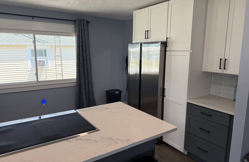 The modern kitchen features beautiful quartz countertops and new cabinetry, fully stocked with nearly everything you'll need for preparing meals. The dining area seats 6 (4 chairs provided), with additional seating for 3 at the kitchen peninsula.