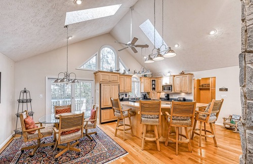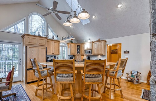 Inside, you'll find an airy, open floor plan, vaulted ceilings, skylights, and floor-to-ceiling windows with stunning lake views. Don your chef’s hat and step into the full, custom-built kitchen to whip up family favorite recipes, then serve up your creations at the breakfast bar, adjoining dining table, or alfresco on the deck. After a day on the lake, multiple gathering spots inside create cozy spaces to gather with loved ones. Watch the latest programs via the free DirecTV on the new 70-inch TV upstairs, pop a movie into the DVD player, or play a friendly game of pool or cards in the living room downstairs. A variety of kid’s games, toys, and books will keep the littlest members of your party happy.