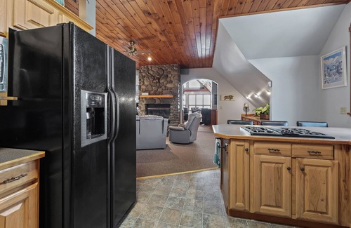 Upstairs is where you will find all of your indoor entertainment! High ceilings and a wall of windows facing the slopes make for a spectacular setting as you enjoy time with family and friends. Play a game of pool, poker at the card table or have a drink at the bar. The wood burning fireplace divides the upstairs and can be accessed on both sides. The large kitchen features a breakfast bar, gas stove, dishwasher and full refrigerator. It is fully stocked for all of your cooking needs. A solid wood dining table seats 8.