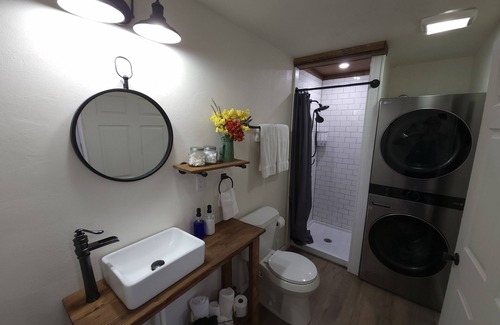 Dirty clothes or staying multiple day? We have a large capacity stacked washer and dryer! Steam capabilities!