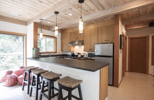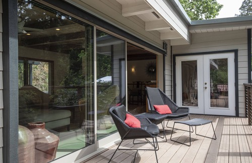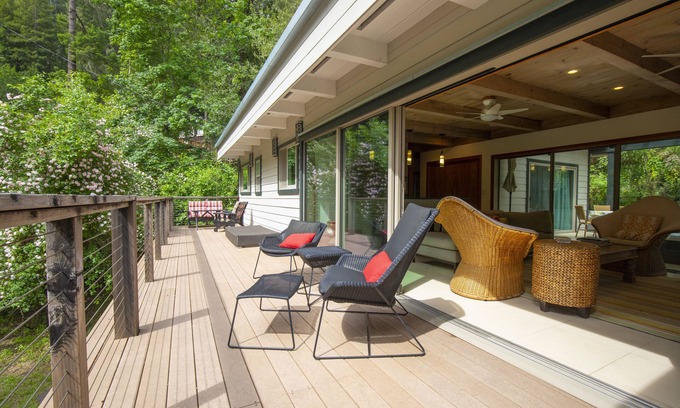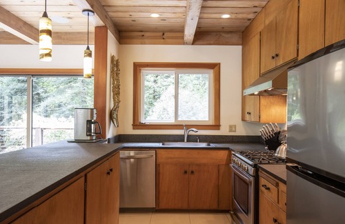 This home has been recently remodeled and furnished by an interior designer and features 16' sliding doors opening to front and covered back decks for truly indoor/outdoor living and is a serene, relaxing home with a leaning to Asian aesthetics. The primary bedroom, with queen bed, opens to the back deck and the master bath features a large shower with two shower heads. The guest bedroom has two twin beds and the guest bath has a tub/shower combo. Not suitable for handicap access due to steep interior stairs. Maximum stay: 4 nights. No children under the age of 5 years. No pets including service animals due to severe allergies. Exterior camera at entrance. Central heating and a fireplace keeps guests warm in cooler months. Sit on the front deck in the morning sun, enjoy a cup of coffee and watch the birds in the redwoods!