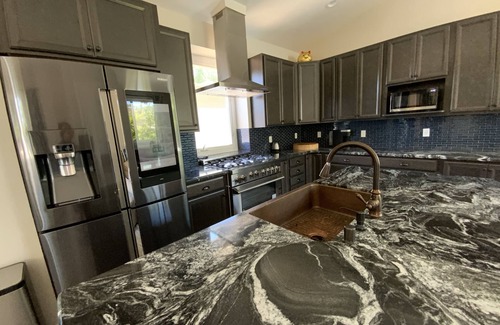 There is oodles of natural sunlight in our new home and you can gaze out any of the large windows to admire the fruit trees and enjoy the company of our beautiful, free-range chickens. The enviable chef's dream kitchen boasts brand new appliances and phenomenal fixtures: 6-burner gas stove, Wifi-enabled 4-door refrigerator, dishwasher with timer, microwave, and a super efficient toaster oven. The exquisite farmhouse copper kitchen sink, bronze faucet with pull-out handle, garbage disposal are surrounded by the cool intergalactic black and white granite countertops with a azure backsplash for pop.