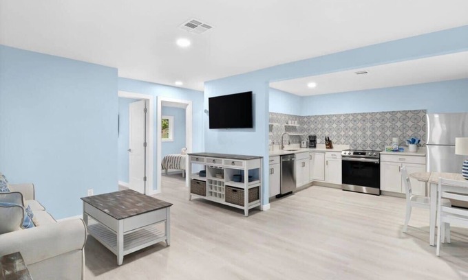 The kitchen is fully equipped and features brand new appliances, sparkling quartz countertops, and makes a great place to prepare even the most gourmet of meals. The living room is very large and features a queen sleeper sofa and 55 inch flatscreen smart TV. The dining table is an extendable leaf table and can seat up to 4 people using the 2 chairs stationed at the table and the 2 additional chairs we keep in the closet. There is an in unit washer and dryer in the laundry room that is located to the left after walking in the front door. The patio is located through the door on the right side of the kitchen and is private and only for your unit. There is space for up to two vehicles on the right side of the driveway. Please note that the driveway is shared with the other unit located in this duplex (which is rented annually and currently not occupied at the time of this writing) and we reserve the left side of the driveway for tenants of the left unit in this duplex.