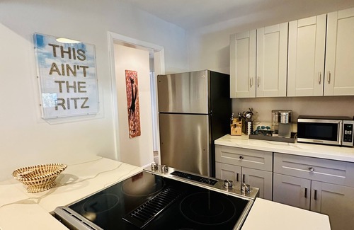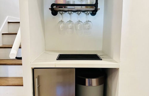 -Fully Stocked Kitchen with pots, pans, utensils, plates/bowls, serving dishes, blender, toaster, hand held mixer, electric can opener, crock pot, drinkware, state of the art oven with convection cooking, microwave, dishwasher, fridge upstairs in the kitchen and another fridge downstairs for over flow groceries.