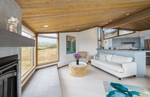 Designed by noted Sea Ranch architect and Bodega Bay resident J. Carson Bowler, this architectural gem full of open spaces and windows offers beautiful views of the coastal meadow, the open ocean, and spectacular sunsets. This is a place for days spent collecting seashells, reading by the fire, and unwinding in the hot tub beneath star-filled skies.