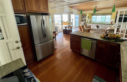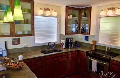 Completely renovated, this updated home has hardwood floors, granite countertops, koa cabinets, stainless steel appliances, air conditioning, iHome docking stations, Bose outdoor speakers with Bluetooth receiver (to pair your own devices and play music), iTouch pre-loaded with various Hawaiian music, wireless internet, full size washer/dryer, brand new California king bedroom set, luxurious bedding, hdtv plasma in great room and bedroom, gas bbq, teak lounges, etc etc. All lights are on dimmers so you can create your own environment and mood. There's even an indoor switch to light up the water at night to create a spectacular view!
