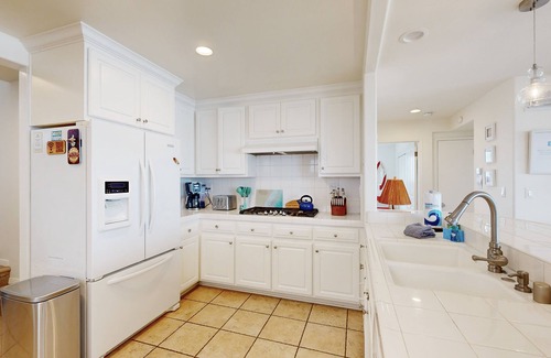 Beachy vibes welcome you into a sunny living space. Curl up on the sectional by a gas fireplace and 65-inch TV. Located on the lower level, a spacious dining area features an eight-seat table, fireplace, and 55-inch TV. The well-equipped open kitchen gleams with all-white cabinetry and appliances. Cupboards are stocked with cooking essentials, and a French-door fridge offers ample space for groceries. Sip coffee at the three-seat kitchen bar.