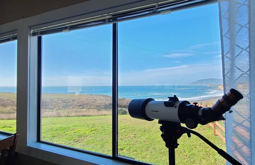THE VIEWS DO NOT GET BETTER THAN THIS! This photo was taken from the dining room table one evening. We recently have been watching the whales from the same dining room table. The panoramic views are breathtaking, whether from the home, the spa, or walking along the beach or picnicking on the bluff. Watch the ocean transform from sunrise to sunset, with the Mendocino Lost Coast framing the horizon. Enjoy a romantic or family-friendly stay in our contemporary home on 5 ocean-front acres. In the evenings enjoy the wood burning stove, or watch the stars and listen to the ocean from the comfort of the hot tub. Walk along the many beaches stretching along the Ocean, and enjoy the tidal pools, seals and vistas. The property shares the private beach shown in the photo, and has it's own private cove, accessible at low tide and known for the sea glass to be found in its sands.