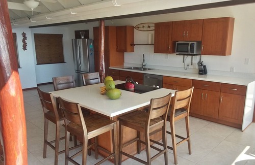 As you come in through the entryway the open tropical style of the place will immediately hit you. The archway through the living room provides uninterrupted views of the bay and the setting sun. The spacious living room provides sleeping space with a king size murphy bed and a full bath. The two master bedrooms both have king size beds which also have incredible views of the bay. But the best part of the house are the unique bathrooms with epic views of the ocean. The fully stocked kitchen is indoor/outdoor and completely modern. Sitting around the island stove preparing a dinner in a group and watching the sunset over the Pacific was a highlight for all the guests we have had.