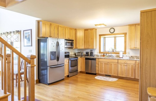 Kitchen--Many of our guests return year after year, and one of their reasons is the large, well-appointed kitchen. Our chef’s kitchen is spacious, well-equipped, and perfect for entertaining or family meals. We provide two drip coffee makers, one French press coffee maker, paper and screen filters, and a coffee grinder. There are many pots, pans, strainers, cutting boards, cutlery (regularly sharpened), two sets of silverware, measuring cups, cooking and serving utensils, pot holders, cloth napkins, kitchen hand towels, small and large plates and bowls, serving platters and bowls, a plug-in countertop grill, crockpot, cookie sheets, blender, toaster, muffin pans, drinking glasses, bourbon glasses, stemmed and non-stemmed wine glasses, placemats, cheese grinder, pet bowls, and beautiful serving dishes. Also provided are many disposables, including two rolls of paper towels, dish and hand soap, dishwasher detergent, glass cleaner, clean sponge, garbage bags, wooden matches, and rags.