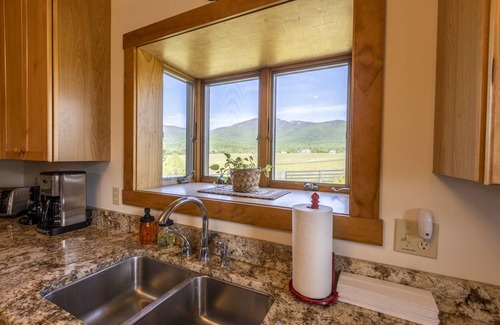 Main Floor Living Area--Represents the finest in open-floor plan, natural light- filled living, with stunning views of meadows and mountains. This space has the dining room table, leather chair and couch, rocking chair, many lamps, a ceiling fan, a wood stove, and lots of windows, with easy kitchen access. The lower-level living room has a large TV, comfortable couches, and a full bath.