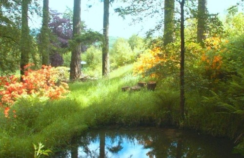 With panoramic and utterly serene views over thickly wooded valleys and rolling green hills, the property is set in a large, 2 acre, sheltered and secluded garden and natural woodland, with babbling streams feeding 5 delightful pools, and a 6 metre waterfalls, floodlit after dark. The garden has many paths, 8 benches, 4 swinging benches, huge hammock designed for 2 people and hanging chairs positioned for inspiring views of the trees, pools and utterly serene views.