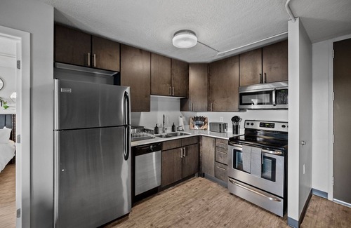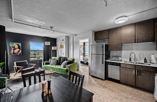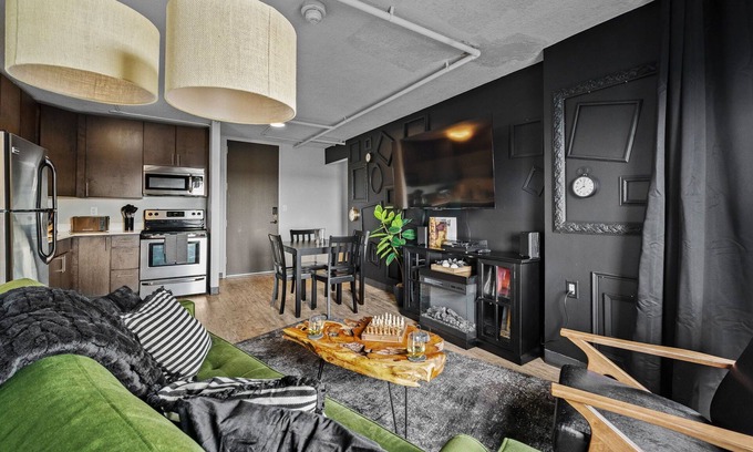 Step into the only two-bedroom penthouse condo in the building, perched on the top floor of Des Moines' trendiest neighborhood. Whether you’re here for a concert at Wells Fargo Arena, a convention, or just exploring the vibrant East Village, our chic and moody pad is your perfect urban hideaway.