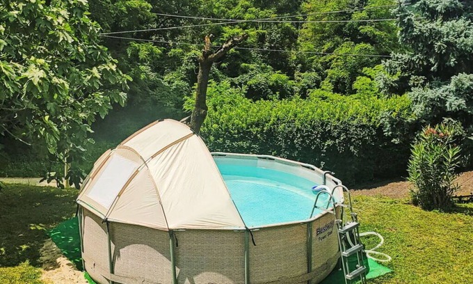 Embrace the serenity of nature as you immerse yourself in the shared natural haven, spanning an impressive 4,000 square meters of pristine meadows and woodlands surrounding the property. Indulge in the luxury of your own private swimming pool, measuring 4 meters in diameter and 110 cm deep, available seasonally from July 11th to October 1st.