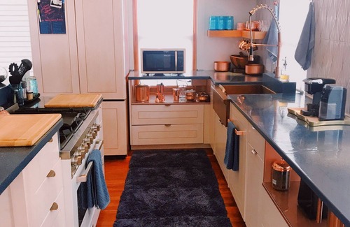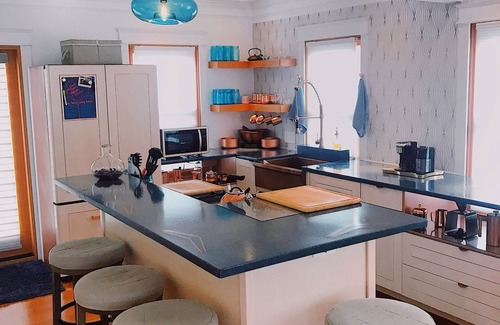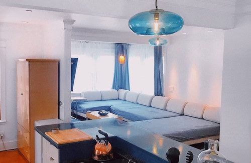 Beautiful quiet beach oasis. 1.5 blocks from the bay with stunning peeks of the water from your window. Custom remodel originally built in 1936 (complete remodel in 2018, everything new except original hardwood floors) with craftsman detailing. Lovely office space with modern mechanical stand-up or sitting desk. Not yet pictured, custom walk in closet. Contemporary furniture with custom copper accents and pulls throughout the home. Modern appliances and Italian range/oven. Full of natural light with abundant window light and the option of pulling the blackout curtains closed for privacy. Original hardwood floors. Floor to ceiling hand painted tile in stunning shower complete with rainfall spout and handheld or overhead 2nd faucet. Freestanding, insulated bathtub. Couches convert to Full size beds should you have additional guests join you during your stay; stay is most comfortable for 1 or 2 persons but could accommodate up to 4 with couches. 30 day minimum. Bedroom has a Queen Size bed.