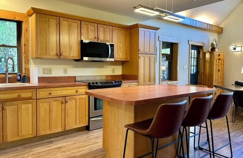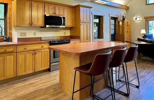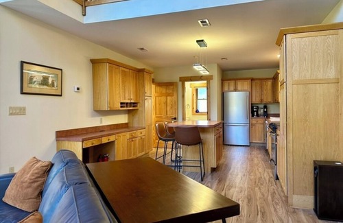 The heart of the home is a bright and welcoming living room, where soft seating and an open layout make it easy to settle in, laugh together, or curl up with a book after a day outdoors. The adjoining fully stocked kitchen is a dream for home chefs and entertainers alike—whether you’re cooking a family feast or just fueling up for your next adventure.