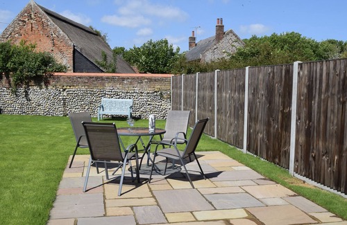 As well as being minutes away from one of the most accessible seal colonies in East Anglia, it is also an easy walk to Horsey Mere (Norfolk Broads) with its iconic National Trust Wind pump. On the other side of the lane to the front of the cottage there is a beautiful old traditional barn being renovated (currently being re-thatched). Curlew Cottage’s lovely large, enclosed and secluded garden is tucked away at the back of the cottage, and is completely private. It has a large terrace with bbq, and a garden table with seating for 4.