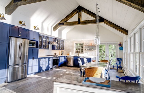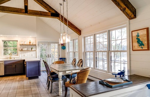 Our home has stunning views of the lake and Okemo with an entire wall of windows across the living room and kitchen, 20ft high ceilings with huge architectural beams. The openness makes it possible for everyone to feel connected across the kitchen and living room and even out to the deck! This house stands out from the rest with its unique fresh, nautical feel – lots of blue and white to make you feel at one with your surroundings and a seemless transition from indoors to out.