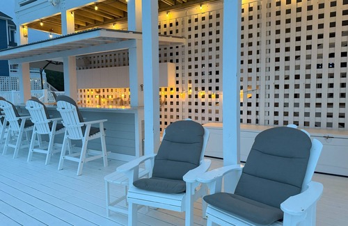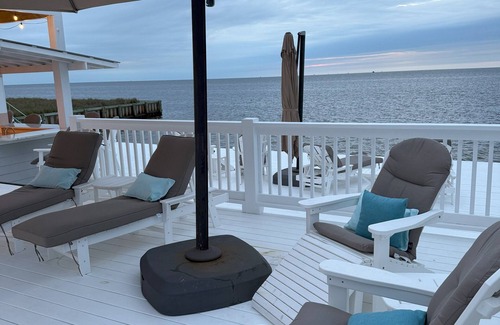 Welcome to Mail Landing! If you love a magnificent and rare view, this is the place for you! Our fully renovated family vacation home has 4 comfortable bedrooms and sits feet away from Pamlico Sound. Located on the top floor, the first guest suite features a king bed, an 80-inch flat-screen w/Apple TV, and an en-suite bathroom with double sinks, a jetted tub, a separate shower, and a private toilet. On the lower level, the second guest suite features a queen bed, a 40-inch smart TV, and an en-suite bathroom with double sinks, a jetted tub, a separate shower, and a private toilet. Also on the lower level are the bunk and daybed rooms. The bunk room features a twin-over-full bunk bed and a twin trundle bed. The daybed room has a twin-sized bed. There is an additional full bathroom on the lower level and a half bathroom on the top floor. The family room offers an additional full bed (Cordaroy's bean bag chair) for extra sleeping space. The well-appointed kitchen, dining room, and living room with curved 55-inch HDTV are on the top floor. All levels offer deck space and breathtaking views of Pamlico Sound. The main feature of our house is the fenced-in back deck, which takes you to the water's edge! The deck space includes a heated pool and an outdoor bar (with running sink, ice maker, and charcoal grill). There is also an outdoor shower. The house also has a cargo lift, perfect for transporting groceries and gear to the upper levels. Parking under the house is open for guests, and access to kayaks (2), paddle boards (3 inflatable), pool toys, and other beach-going items are on-site and ready for use!