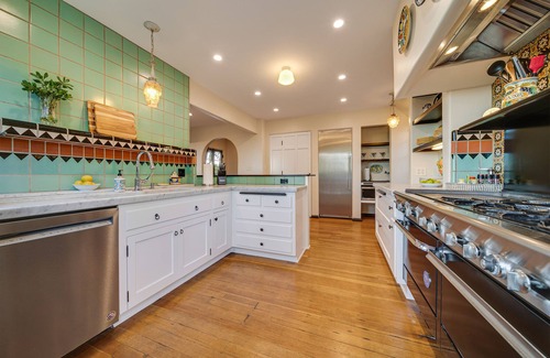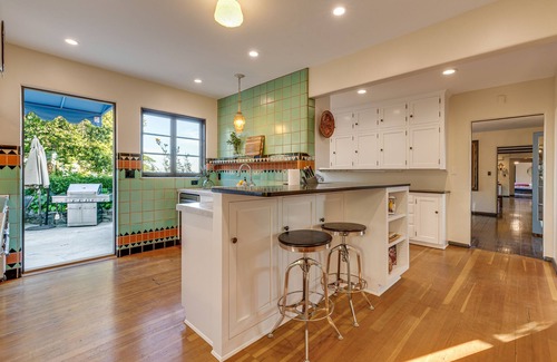 This luxurious California Hacienda estate seamlessly blends historic charm with modern comfort. The owners have offered to adjust this home to be able to be able to accommodate a larger family by providing access to the entire property, which includes a previously inaccessible primary suite & adjacent multifunctional changing room or den. The large bathroom with heated floors & beautiful views is the perfect way to start & end your day. Additionally, they have offered access to the oversized three car garage & have EV charging available too. Located in the prestigious hills of Glendale, this property boasts a spacious living room with restored original French doors on both the north & south sides, a cozy Kiva fireplace, & classic restored hardwood floors throughout. Flow from the living room into a formal dining area, leading to the expansive kitchen with a breakfast bar & the restored original butler’s pantry.