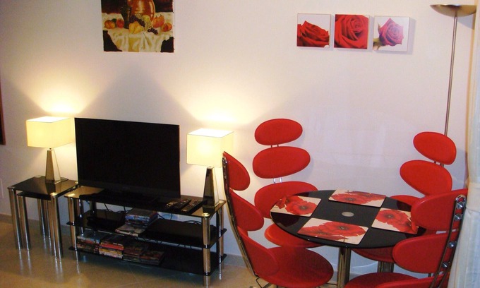 In the living area of the apartment there is a modern table and four chairs, a top of the range 32' Sony LCD TV with decoder with a choice of over 1000 channels in different languages. In addition there is a Sony Blu-Ray DVD player and an iPod/iPhone docking station for music lovers. A selection of DVDs and CDs are also provided for your enjoyment.