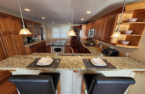 There are two king bedrooms, each with 55’ Smart TVs, two queen bedrooms, and a fifth bedroom with twin beds. The primary king suite is on the main level.