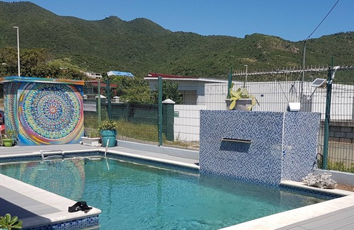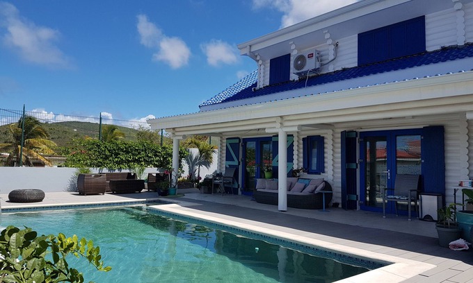 Welcome to our unique Logcabin house in the heart of french Saint Martin. Surrounded by beautiful mountains, this comfortable 2 bedroom, 1.5 bathroom Triplex house is the perfect place to relax after a sun filled day on the beach. Have a dip in the private pool, enjoy the breeze in the lounge area or read a book on the porch. The modern living room and kitchen area invite you to prepare your meals and be entertained by a movie.