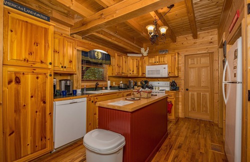 The kitchen with it's butcher block island is roomy and well appointed to handle any of your cooking needs. Bear themed dishes and cutlery make every meal special.