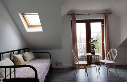 This apartment is kept in superb condition. With new wooden floors, carpets, and kitchen it is immaculately clean, warm and bright, with natural light coming in from the double-doors and sky-light windows in the living area. It has a spacious, open plan, main living space comprising a king-size sofa bed, table & chairs, and well-equipped kitchen. There is a washing machine, microwave, hairdryer, ironing board and iron. The bathroom has an excellent rain shower facility with instant hot water. Perfect for a family of four or couple coming to Belfast for the weekend. It is also suitable for longer term stays, solo travellers. It has a dedicated workspace with desk and ergonomic chair for professionals coming for work. While based in a busy up-market and bustling commercial area, this apartment is also a very calm and tranquil space.