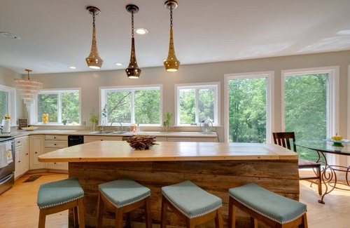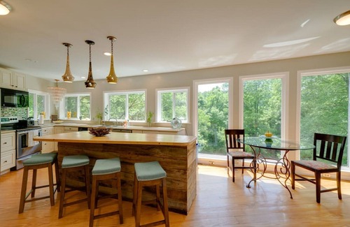 This place is fantastic! A feast for your eyes. Beautiful inside and out. The Mansion is a three-story building with an elevator. The bottom floor is not yet completed, so we don't have pictures posted, but there is a full bathroom that large groups may have access to if needed. We ask that groups also book the neighboring small treehouse. They are separate rentals that share a deck and the hot tub is currently near the smaller treehouse. I have blocked off all weekends to have the smaller treehouse available for mansion guests to book on request. I want all of our guests to have the best experience possible. For example, if a couple is renting the small treehouse and next door in the mansion they are having a gathering it could affect the quiet enjoyment of their stay. Groups that rent both treehouses will have an exclusive private experience with no shared decks or hot tubs. It is a win-win for all involved.