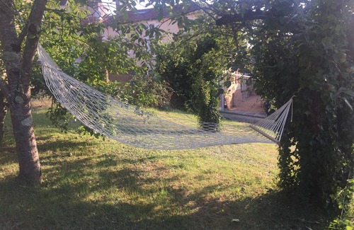 There are lots of activities in the local area including fishing, water skiing, canoeing and bungie jumping! You can walk down to the river at the campsite where there is a babys pool, small riverside beach, crazy golf, boules and a small bar! The futuristic amusement/adventure park of Futuroscope can be reached within an hour by car and the stunning fishing village of La Rochelle in under two hours. The monkey sanctuary La Vallee des Singes is well worth a visit is just under an hour away. The house itself consists of an open plan ground floor that in true french style is a combined kitchen, dinning room and sitting room. This room has lovely oak beams on display and open fireplace that will keep the whole house warm in the winter months. Up the oak staircase is the rest of the accommodation which consists of two double bedrooms, the first mezzanine bedroom you enter from the stairs and then into the hallway where there is the bathroom and main bedroom, both about 11 square meters in size. Opposite the house is the large garden that is laid to grass and is full of fruit trees complete with hammocks and a BBQ. The house has all appliances you'll need i.e washing machine, oven, microwave, TV/DVD etc. Both the house and the village in which it is situated are really lovely and should you be looking for a pretty little house in beautiful countryside then this really is the place for you.