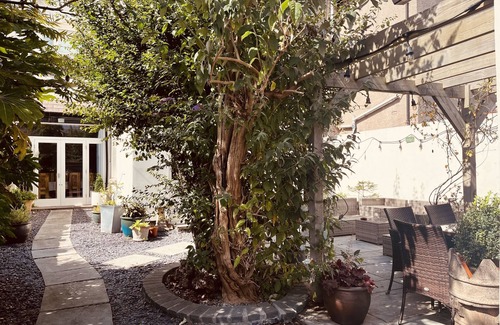 The second reception room is a large open plan kitchen diner with comfy sofas and a dining table that seats 12. The dining table overlooks the courtyard and is positioned by french windows that open and fold back fully. This room is a great area to gather in the mornings for a hearty breakfast or for those special occasions spending time together eating, drinking and playing board games. There is a log burning stove and the area is perfect for family gatherings. One of the sofas in the dining room is a sofa bed providing disabled living options for guests. This great space opens up to a large fully equipped kitchen along with a third sofa in a sunny area by the rear french doors. Beyond these, step out onto a beautiful Mediterranean style courtyard which has original stone-built feature walls. A great warmly lit outdoor space for BBQ's and gathering together with a large clay chiminea providing warmth in the evenings.