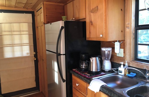 The cabin features a separate bedroom with a queen-size bed and a versatile sleeping/meditation loft, comfortably accommodating up to four guests.