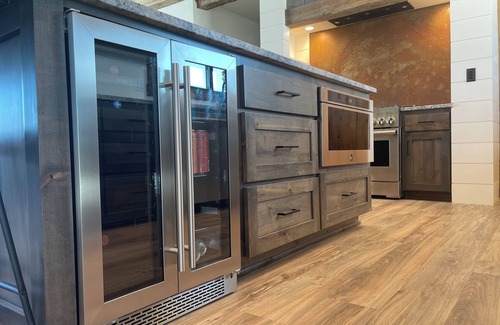 On the main level, you’ll find a spacious kitchen with granite countertops, stainless steel appliances, six burner propane range, wine fridge and comfortable bar top seating for 6. Fully stocked with pots, pans, dinnerware and everything you need to prepare a gourmet home cooked meal. There are 2 dining tables with enough seating for the whole crew.