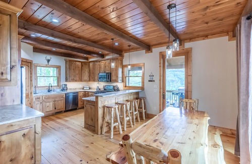 This stunning cabin features a wealth of amenities that enhance the romantic atmosphere of your wedding celebration. Enjoy the expansive deck complete with a luxurious hot tub, perfect for relaxing after the festivities while admiring the natural fog that graces the Smokies. The open-concept kitchen is ideal for catering your event or hosting family meals, and the spacious common areas—with rustic furnishings, plentiful windows, and even a pool table—invite joyful gatherings and celebrations. Each of the four bedrooms boasts its own bathroom, ensuring comfort and privacy for you and your guests.
