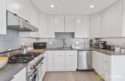 The fully equipped kitchen is a chef's dream, featuring modern appliances and ample counter space. Enjoy your morning coffee at the breakfast bar with seating for two.