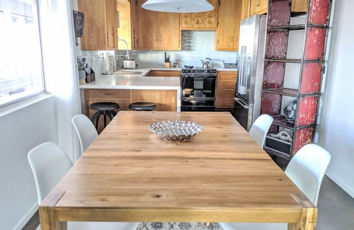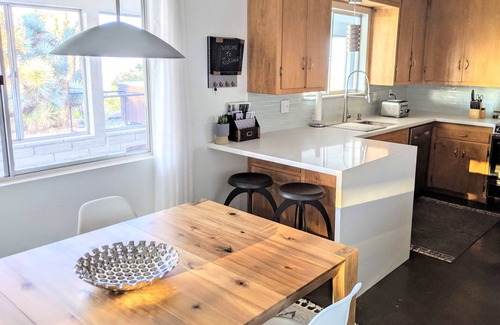 The house is located on 3 acres of land at the foot of the Joshua Tree hills. It is newly renovated, modern with mid-century and rustic touches and beautiful concrete floors. It has a full kitchen and dining area, with most everything you could need for cooking.