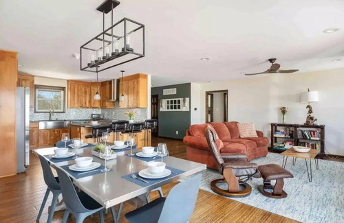 The kitchen features a farmhouse sink, an induction cooktop, a wine fridge, and a double oven. With these great appliances, you'll be able to take some of the essentials we've provided and the groceries you bring to make an unforgettable meal.